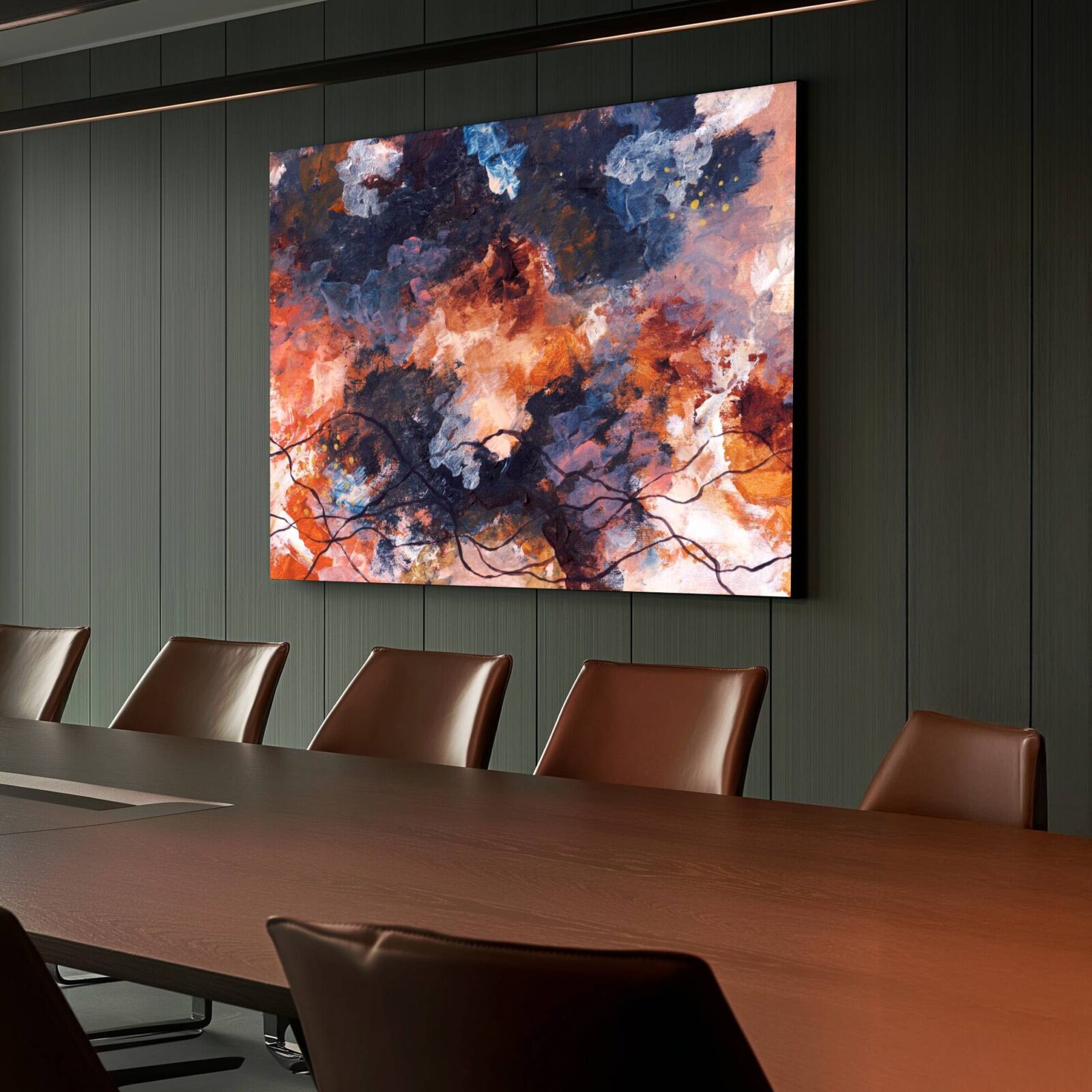In a founder’s office or high-focus executive space, a subtle abstract piece might live on a side wall, not visible while working, but visible during reflection or meetings, subtly shifting the emotional temperature of difficult conversations.